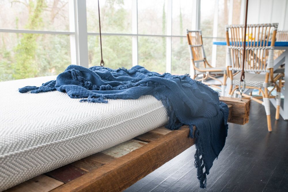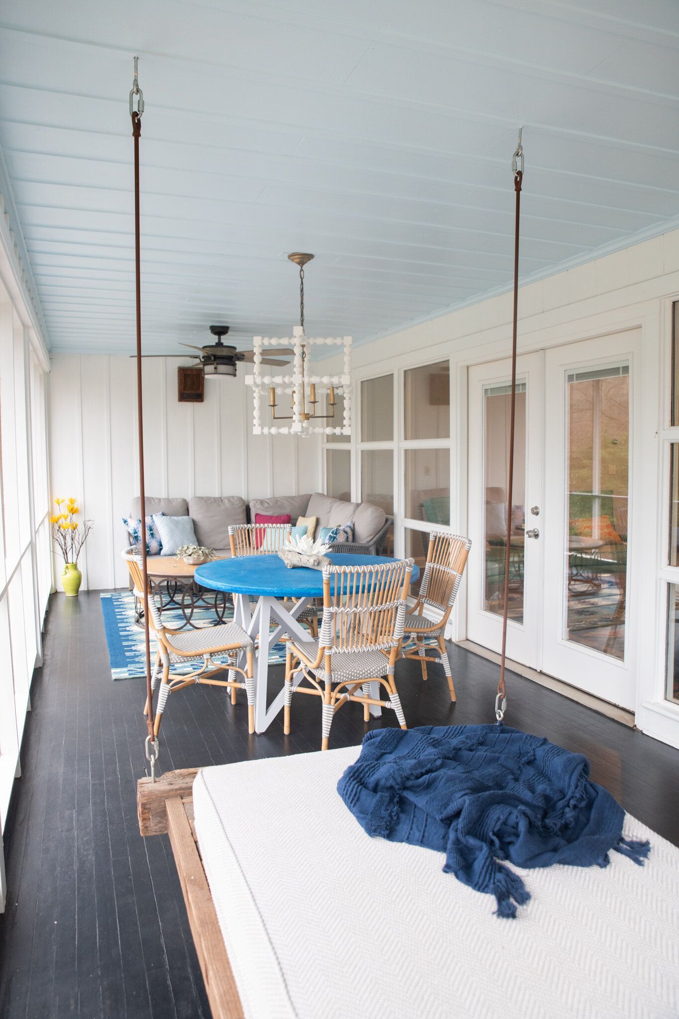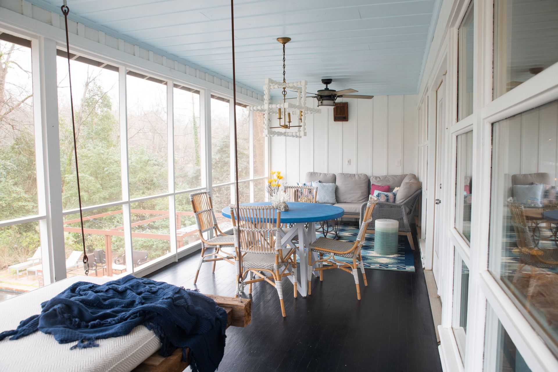 We had a previous opportunity to help this fun, young family add some color to their main spaces in their home, so when they asked us to update their porch we excitedly said yes! We utilized cool colors and a beachy vibe to transform this porch into their very own backyard oasis. They can now get away and relax, just by stepping out the door.